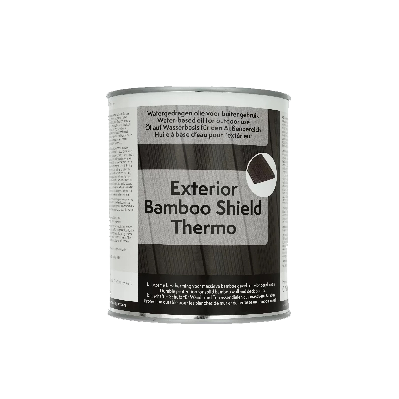 A Bamboo Shield Terrace Olaj kiváló választás és minőségű kültéri olaj a bambusz teraszburkolatok védelmére, illetve egyéb teraszdeszkák, kerítésdeszkák és homlokzatburkolatok védelmére is kiválóan alkalmas. A Bamboo Shield karbantartó olaj egy vízbázisú olaj, gyorsan szárad és természetes megjelenésű. Pigmenteket és UV-védelmet adnak a külső olajhoz, így a bambusz hosszabb ideig megőrzi gyönyörű színét. A Bamboo Shield dió színben kapható, és mélyen behatol a bambusz termékbe. A bambuszolaj mély védelmet nyújt, valamint víz- és szennyeződésálló felületet biztosít. A Bamboo Shield teraszolaj keményfa olajként is használható keményfa terasz vagy kerti bútor védelmére.